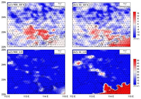 Figure 6 shows the significant differences in the process of convective triggering in numerical simulation, which are noted in sensible and latent heat fluxes and horizontal winds. At midnight, the UHI caused by the PRD urban agglomeration gave rise to the ground’s stronger sensible heat flux, even exceeding the temperature of the ocean. On the one hand, the underlying surface of the city contains a large number of artificial structures, such as asphalt roads, concrete, etc., whose thermal properties will change the heat exchange between the atmosphere and the ground, resulting in unstable atmospheric stratification. On the other hand, the water content of the urban surface decreases, and the surface evaporation and latent heat release are reduced. In addition, a large number of boilers, heaters, air conditioners, and other heating devices in the city, as well as man-made emissions from motor vehicles, make the temperature of the city much higher than the ambient temperature, forming a UHI []. Overestimation of urban areas will lead to a stronger UHI effect in the model. Therefore, in the high-resolution underlying surface data test GLC_30, the decrease in urban area close to the actual situation and the increase in green space and surface runoff make the UHI effect slightly slow down, and the sensible heat flux is weaker than the CTL_900 test. It is worth mentioning that after the introduction of high-resolution underlying surface data, the temperature gradient in the convection triggered area in Huadu has increased significantly. The strong temperature gradient zone formed by the descending cold air in the Huadu Mountain area in the north of Huadu and the warm and humid flow through the UHI of Huadu, is the reason for Huadu convection triggering.