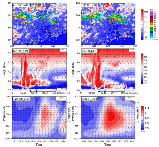 (a1,b1) radar echo (shaded, dBZ) and terrain (shaded, m) at 1900 UTC on 6 May 2017; (a2,b2) vertical profile of GPT (shaded, K) and horizontal wind (arrow, m·s−1) along the black line in (a1,b1). Black triangles indicate Huadu Mountain, blue triangles indicate Baiyun Mountain, and green triangles indicate Lantau Island. Red lines show the city area, and blue lines show water area; (a3,b3) regional average of vertical velocity (shaded, m/s) and horizontal wind field (vector): (a1–a3) CTL_900; (b1–b3) GLC_30.