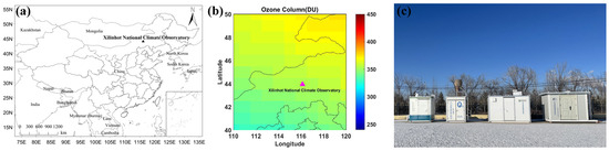 Schematic of the geographic location of the Xilinhot National Climate Observatory (a), the ozone total column distribution at the experiment location and surrounding regions derived from satellite observation (b) and four ozone lidars in the experimental field (c).
