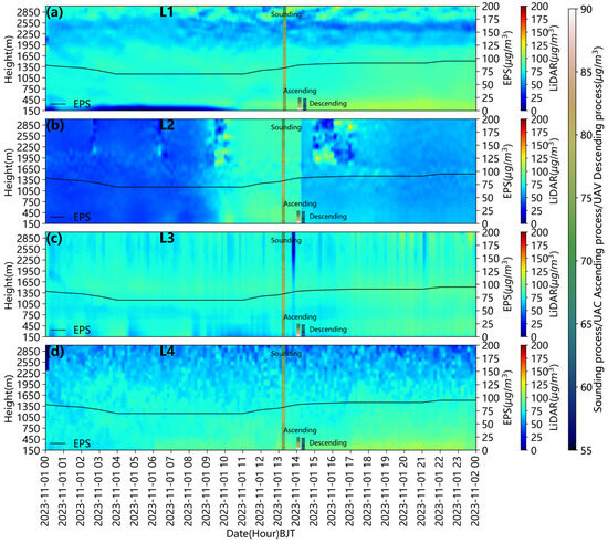 Co-current observations on 1st November 2023. Sub-figures (a–d) indicate ozone lidar model L1, L2, L3 and L4, the black line within figures are time series of surface ozone observation at EPS. The profiles observed using ozone radiosonde and UAV ozone analyzer are shown at around 13 and 14 BJT.