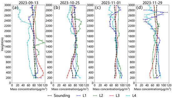 Four clear days (13 September, 25 October, 1 November and 29 November, respectively) were selected to compare ozone lidar data with ozone radiosonde profiles. The comparison focused on the period from the time when the radiosonde balloons were released until they reached an altitude of 3000 m, matching the corresponding time frame of the lidar observations. As shown in Figure 3, the ozone profiles observed using lidar and ozone radiosonde exhibited a good consistency between the altitudes of approximately 400 and 2000 m. The ozone concentration deviation between the ozone lidar and radiosonde data gradually became larger as the detection altitude increased, especially above 2000 m.