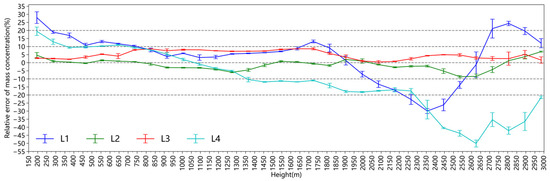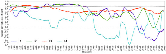 A more systematic analysis was also conducted by comparing the ozone lidar data with 17 ozone radiosonde observations (excluding the precipitation event on 24 August 2023). The ozone concentration profiles of both measurements were stratified at vertical intervals of 50 m, setting the ozone radiosonde observations as the reference. Then, the relative deviation and Pearson correlation coefficient were calculated at each height layer and for the four different models of ozone lidar. As can be seen in Figure 4, near the detection blind zone from 150 to 400 m, the average relative deviation of ozone concentration between the ozone lidar and radiosonde data is not significant, mostly within 20%. As altitude increases, the average relative deviation gradually decreases. The deviation is generally within 10% for most models of ozone lidar between the height of 400 and 2000 m, indicating good consistency. Above the height of 2000 m, the average relative deviation and errors increase with altitude. Simultaneously, a Pearson correlation analysis was conducted for the ozone lidar and radiosonde detection results at different altitude layers (Figure 5). Between the height of 150 and 1500 m, the correlation coefficient of ozone lidar with ozone radiosonde data is generally around 0.6~0.9 for most of the models of lidar, excluding model L4. While above the height of 1500 m, the correlation between the two types of observational data gradually decreases as the altitude increases, and the fluctuation amplitude increases as well. Above the height of 2300 m, the correlation coefficients for most models of lidar drop below 0.5, indicating that the detection accuracy of most ozone lidars decreases significantly. In spite of the different settings of the telescope, laser pulses and single laser energy, the four models of ozone lidar apply different signal processing and inversion algorithms. These differences, both in the hardware and software of model L4, have resulted in its outlying performance.