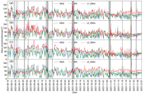 Surface ozone measurements were used to verify the accuracy of near-surface ozone detection via the ozone lidar. The surface ozone data observed at EPS, which is the nearest to the Xilinhot National Climate Observatory, were used as the baseline value, while the data from a slightly more distant station, named as MGS, served as the reference value. The time variation in the ozone mass concentration data of the two surface ozone stations and the retrieved ozone concentration at an altitude of 300 m from the ozone lidars were compared from 18 August to 31 November (Figure 6). Since precipitation significantly affects the inversion of ozone lidar data and cannot objectively reflect the actual ozone mass concentration, precipitation periods were excluded based on ground meteorological observations, as the dashed lines and gray shaded areas show in Figure 6.