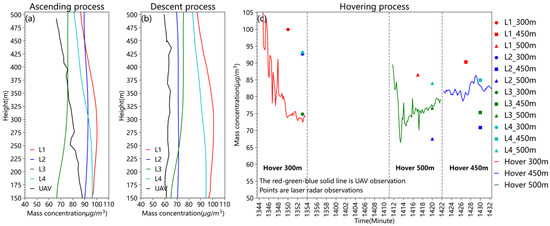 In Table 2 and Figure 8, the ozone profiles and concentrations observed using the ozone lidars and the ozone analyzer on the UAV were generally consistent, especially during the ascending and hovering periods. Specifically, the ozone profiles observed by the analyzer on the UAV were interpolated to a vertical resolution of 7.5 m, the same as that of the ozone lidars. The average relative deviations between the lidar and the UAV measurements were between 0 and 35.1% during the ascending period. During the descending period, the average relative deviations ranged from 6.4% to 61.7%. When hovering at a height of 300 m, the average relative deviations between the ozone lidars and the UAV measurements were between 2.7% and 35.0%. At a height of 450 m, the relative deviations ranged from 2.0% to 14.9%. The consistency increased at 500 m height, and the average relative deviations were between 1.1% and 13.6%. To summarize, the average relative deviations of the ozone profiles observed using lidars and UAV measurements were comparable to that of the ozone sounding beneath the height of 500 m, as suggested in Figure 4.