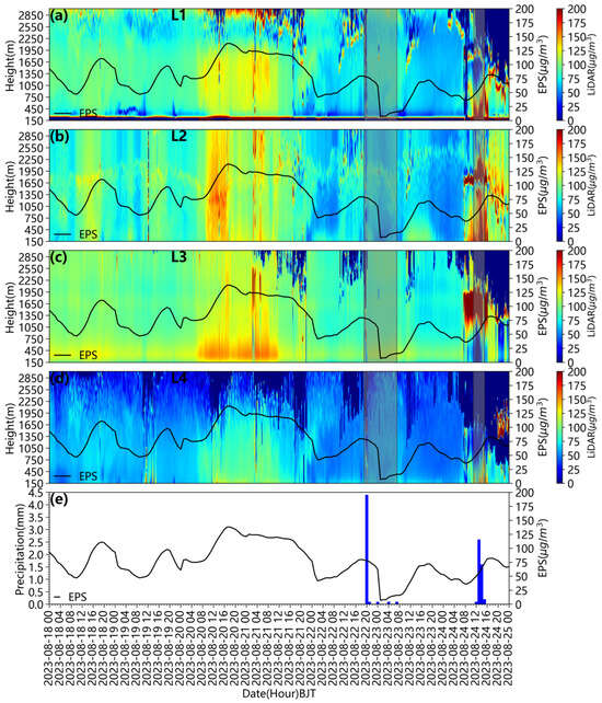 Vertical monitoring and inversion results of 4 models of ozone lidar from August 18th to 24th, 2023. Sub-figures (a–d) indicate model L1, L2, L3 and L4, the black line within figures are time series of surface ozone observation at Environmental Protection station. Sub-figure (e) shows time series of precipitation (mm).