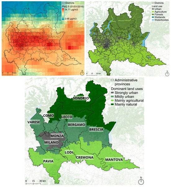 Mapping of the analyzed territory of the Lombardy region, in Northern Italy, with a heatmap representation of a sample of PM2.5 concentration and the superimposed boundaries of territorial districts of approximately 100,000 residents (upper left panel), together with the land-use distribution across the territory (upper right panel), and administrative provinces with a qualitative indication of the main land-use class characterizing the territory of each district (lower panel).