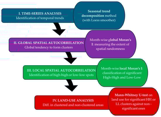Technical roadmap of the methodologies applied to infer information about the temporal and spatial patterns of air pollution concentration in the territory of the Lombardy region, in Northern Italy, and about the impact of land use into spatial clustering.