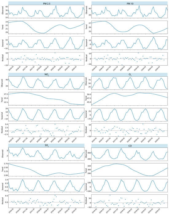 Decomposition of the pollutant concentration values (µg/m3) (through trend and seasonal decomposition method—lines—based on LOESS smoother), along with the resulting residuals (dots) left after fitting the model relevant to the daily air quality data from 2016 to 2020 (as reported by Copernicus CAMS reanalysis data) for the territory of the Lombardy region, Italy.