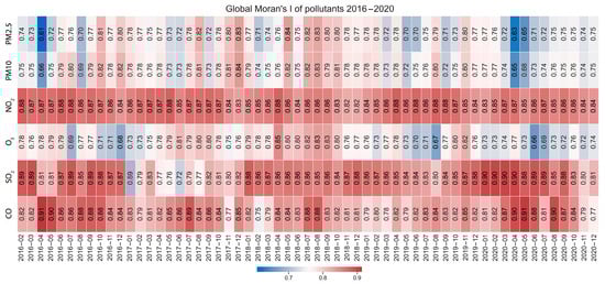 Values of global Moran’s I to measure the spatial autocorrelation for different air pollutants, month by month from 2016 to 2020, on the territory of the Lombardy region, Italy. Air pollution data were derived from the Copernicus CAMS reanalysis dataset.