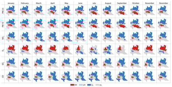 The global Moran’s I, indicating the extent of spatial randomness in the pollution concentration among the districts, produced results varying by pollutant and month. The analysis demonstrated an overall high level of clustering (as reported in Figure 4), with all the months achieving values over 0.60 and soaring as high as 0.91 (recorded for CO, in April 2016 and May 2020). For NO2 and SO2, the autocorrelation was higher and more consistent in different time frames. The clustering patterns for PM2.5, PM10, and O3 showed different results and did not indicate any periodicity by month during the study period. This strong clustering pattern in the pollutants further warrants an investigation of its detailed location, which can be determined using local spatial autocorrelation.