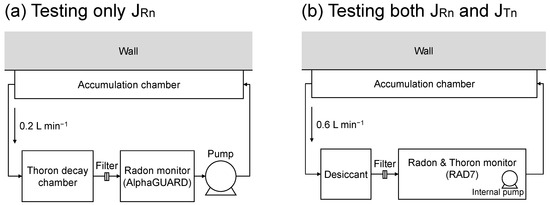Radon and thoron exhaled from the wall were accumulated in the chamber and simultaneously measured using either of the two monitors: a pulsed ionization chamber (AlphaGUARD PQ2000 PRO, SAPHYMO, Frankfurt, Germany) for radon monitoring, and a passivated ion-implanted planar silicon detector with an electrostatic collection of charged alpha emitters (RAD7, DURRIDGE, Billerica, MA, USA) for radon and thoron monitoring (Figure 1a,b). As shown in Figure 1a, a thoron decay chamber was set in the measurement system to prevent thoron from flowing to the monitor (AlphaGUARD) that cannot discriminate radon and thoron. This chamber was simply an airtight acrylic box, and its size was designed so that thoron can remain in it for more than 10 min, corresponding to 10 half-lives, and its activity concentration can be reduced to <1/1000.