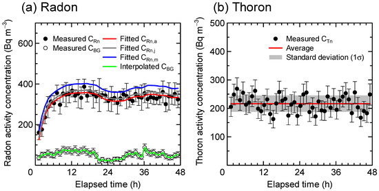 The radon exhalation rate was obtained by fitting a mathematical model to the time plot (Figure 2a). The change in radon activity concentrations, CRn (Bq m−3), can be given by the following three-compartment model with the varying CBG: