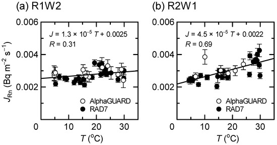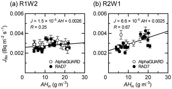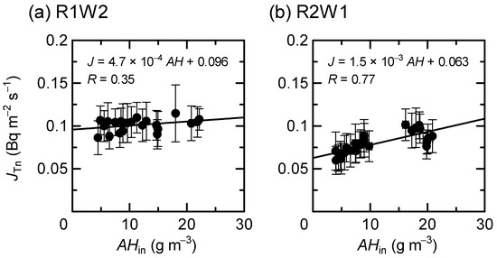 This study obtained in situ data on JRn and JTn from the two solid walls for over a year. The data on JRn determined based on the different measurement systems using AlphaGUARD and RAD7 were combined to more clearly see its dependence on temperature and humidity. Although the data analysis methods for both systems were validated in a previous paper [18], we should be careful about the fact that the desiccant used for RAD7 dramatically dehumidified the internal air of the measurement system generally down to 5% or less in relative humidity (see RHsys in Table 1). It should be considered whether such low humidity induced unusual JRn values that were not comparable to those measured using AlphaGUARD. It is apparent from Figure 3 and Figure 4 that there was no significant discrepancy of JRn between both radon monitors, which validates the combination of those data. Furthermore, this suggests that AHin can be treated there as an alternative parameter instead of AHsys, which is supported by the fact that a strong positive association was actually observed between AHin and AHsys (R = 0.93).