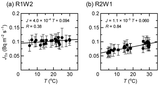 When it comes to the effect of T on JRn, our data were close to the laboratory testing data from Stranden et al. [16]. Here, we consider their data at T close to our temperature; they indicated the increase in JRn by a factor of 1.2–2.0 with increasing T from 5 to 22 °C. However, they only provided a single JRn value without its uncertainty at each T, so more reliable and supporting data are desired in the future.