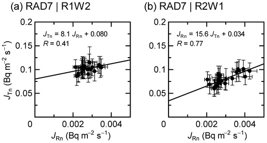 Finally, to examine the results in Figure 7, where the correlations seemed more or less different between the walls, other factors affecting JRn and JTn are discussed through simple theoretical calculations. The literature presented a mathematical model expressing an exhalation rate J (Bq m−2 s−1) from the solid wall with a thickness of d (m) [7,20]: