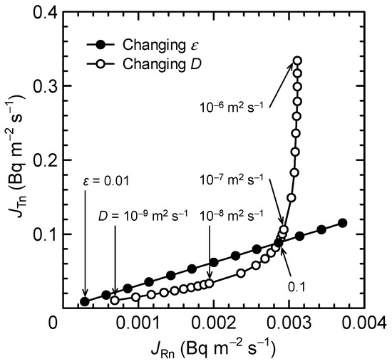 Figure 8 shows how JRn and JTn can theoretically change within possible ranges of D (10−9–10−6 Bq m−2 s−1) or ε (0.01–0.14). As expected, an increase in ε can linearly amplify J, resulting in a linear relationship between JRn and JTn; the same relationship will be seen with changing C and ρ, as well. Changing D had a different relationship between JRn and JTn, where it exhibited a gentle or steep curve below or above D = 3.0 × 10−8 m2 s−1, respectively. This means that D greater than a critical level can have an essential impact only on JTn because most radon atoms with a longer half-life of 3.82 d can readily diffuse out of the wall to the atmosphere, even with low D.