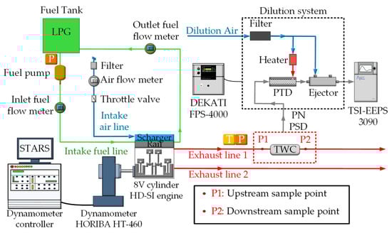 Figure 1 shows the experimental setup used during the tests. The engine was connected and controlled using a Horiba HT-460 dynamometer, which allows for the instant control of engine speed and torque using the STARS software V 1.9.48.617. The fuel was supplied to the port injection system with a line that connects the fuel tank with the engine inlet. Another line diverts unused fuel from the engine back to the fuel tank. The fuel consumption is calculated using two flowmeters, one arranged upstream of the engine and the other downstream. Likewise, a parallel line equipped with a flow meter supplied air to the engine. The engine features two exhaust lines, each corresponding to a cylinder bank. A TWC is installed within one of these lines. Additionally, two sampling points facilitate the measurement of PN and PSD both upstream (P1) and downstream (P2) of the catalyst.