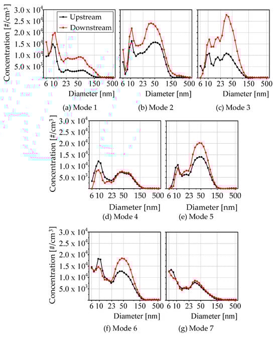 For modes M4 (Figure 5d) and M5 (Figure 5e), characterized by exhaust and temperature values in the intermediate range with temperatures of approximately 600 °C and exhaust flow rates between 120 kg/h and 250 kg/h, no significant differences were observed upstream and downstream of the TWC. Similarly, for modes M6 (Figure 5f) and M7 (Figure 5g), with temperature values around 700 °C and exhaust flows exceeding 250 kg/h, the outcomes were comparable. In these scenarios, the particle formation from UHC was found to be lower than in modes M1 to M3. This reduction is attributed to the high conversion efficiency of UHC, thereby preventing particle formation and enhancing the oxidation of small organic particles []. Additionally, this capacity to oxidize small particles, coupled with potential agglomeration processes, led to a decrease in particles smaller than 23 nm, as previously documented in research under similar operating conditions [,]. This agglomeration process, particularly evident in modes M4 and M7, resulted in a slight increase in particles approximately 50 nm in diameter. This increase may also be partly due to the fragmentation of larger particles, ranging from 500 nm to 1000 nm in diameter.