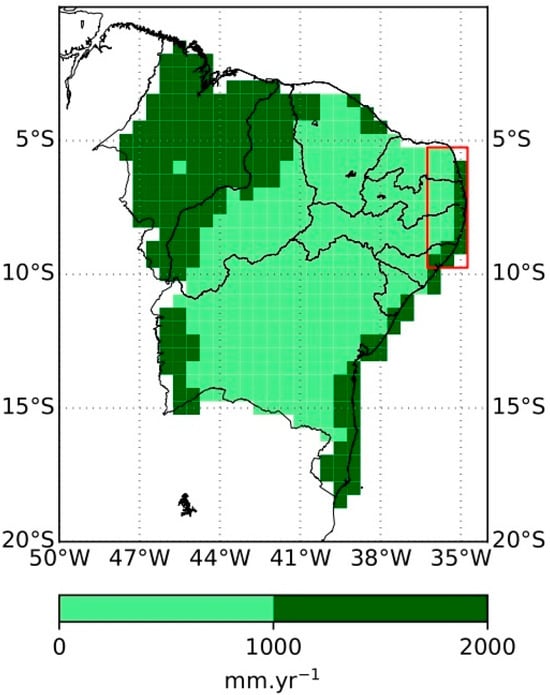 The ENEB region study area, with coordinates on land between 5.5° to 9.5° S and 34.5° W to 36° W (Figure 1), was selected for being characterized as the rainiest region of the Northeast of Brazil (NEB), with mean annual precipitation above 1000 mm, influenced by the orographic effect.