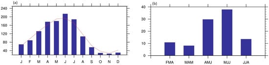 A simple three-point moving average is also calculated. This analysis in essence consists of replacing the actual values of time series with a calculated mean value for filtering noise and converting the data into a relatively smooth curve []. Figure 2a (red line) demonstrates a precipitation pattern with a unimodal distribution for the 3-month moving average. This highlights that the maximum amount of precipitation concerning regional patterns occurs in the period of the rainy season, indicating that a unique maximum point does exist. June represents the maximum point of the curve that corresponds to the climatological average. Thus, the climatological core period of the rainy season occurs within the May–June–July (MJJ) quarter, corroborating with [,]. This result is in line with the highest-frequency period of the EWD events in ENEB []. However, our result differs from the rainy season periods of [,], which were identified to occur in June–July–August (JJA) and April–May–June (AMJ), respectively. Differences may be attributed to distinct analyzed periods.