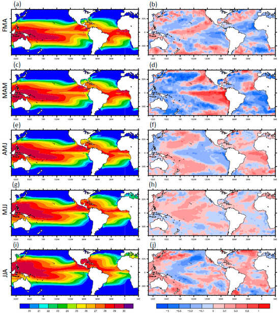 Climatological seasonal SST (°C) pattern (a,c,e,g,i); and SST (°C) anomalies—differences between SST in the specific rainy season of the seasonal period years and SST climatological seasonal mean (b,d,f,h,j) in each quarterly period (FMA, MAM, AMJ, MJJ, JJA) from 1982 to 2018.