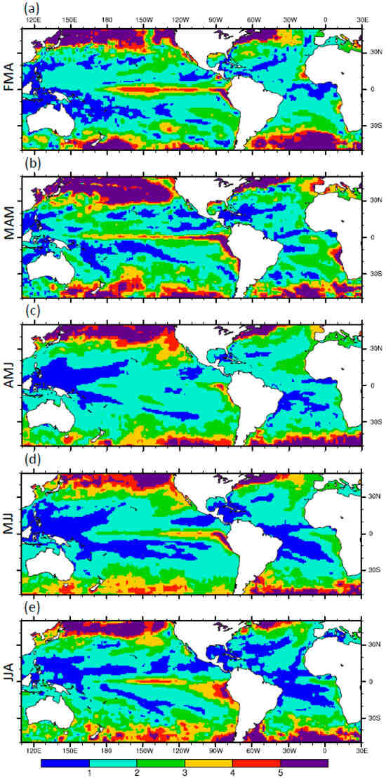 Thus, we filter the regions with the sMAPE index below 1% and present the spatial distribution of ENEB rainy seasons (FMA, MAM, AMJ, MJJ, JJA) over the Atlantic and Pacific regions where the lowest value of sMAPE for each grid point is located (Figure 5a). It is found that there is no dominant rainy season when the lowest value of sMAPE happens over the whole Atlantic and Pacific. Therefore, the largest area of the spatial patterns of Pacific and Atlantic SST that favors the occurrence of the ENEB rainy seasons is for the JJA season (~2.465 × 107 km2)—followed by a gradual decline in MAM season with ~1.955 × 107 km2, FMA season with ~1.839 × 107 km2, MJJ season with ~1.694 × 107 km2 and AMJ season with ~1.223 × 107 km2.