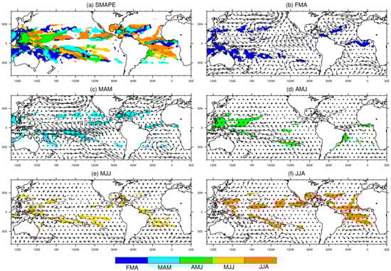 (a) Spatial distribution of lowest sMAPE for ENEB rainy seasons and the composite anomalous winds vectors (m·s−1) for (b) FMA; (c) MAM; (d) AMJ; (e) MJJ; (f) JJA.