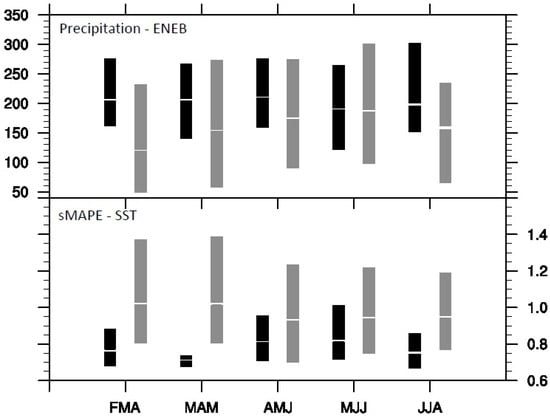 Bars showing data of mean precipitation (mm·monthly−1) over ENEB and seasonal mean sMAPE (%) of the SST over Pacific and Atlantic Oceans, for specific rainy season occurrence (black bars) and climatological 1982–2018 period data (grey bars). Values in bars are mean (white line), max and min variation.