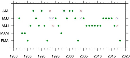 To verify the assumption of predicting the core period of the rainy season using only SST information through the statistical method, we examined the interannual variations of the relationship between the lowest sMAPE value and the highest precipitation that characterizes each rainy season (Figure 7). Our results confirm the aforementioned hypothesis, considering that during the 37-year analysis period, only 4 years (1993, 1994, 2004, 2017) have not met our forecast criteria of the rainy season, which indicates a skill of 0.9. A perfect forecast has received a skill score of 1; therefore, our method indicates a relatively high accuracy for the prediction of the period of the rainy season in the ENEB. In the four years that the maximum values of precipitation did not coincide with the minimum values of sMAPE, the highest precipitation occurred in the MJJ (Figure 7 × blue) while the lowest sMAPE occurred in two different rainy seasons periods: in JJA for 1993 and 2004 years and in AMJ for 1994 and 2017 (Figure 7 × red). In a study conducted by [], the SST anomalies as the predictor field allowed for a reasonable predictability, with a 0.76 of correlation between the observed and the predicted precipitation time series for the FMA in the NEB.