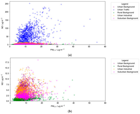 The relationship between NO and PM2.5 at the RB, SB, UB, UI, and UT environmental sites is shown in Figure 2. Primary NOx emissions occur almost exclusively in the form of NO, and due to NO oxidation occurring on a very fast timescale, a positive correlation between NO and PM2.5 was taken to indicate a strong primary source of PM2.5. As expected, the highly polluted UT environments dominated the axis of Figure 2a. As the most significant UK primary emission source of NO is from car exhausts [42], this site type recorded significantly higher NO concentrations compared with other site types. The largest number of PM2.5 measurements above 30 µg m−3 can also be attributed to the UT site type, including the highest PM2.5 concentrations recorded. This is indicative of significant primary PM2.5 emissions at high traffic sites, a result of both exhaust emissions and non-exhaust emissions, such as tyre and brake wear, road dust, and abrasion [43]. A strong positive correlation indicates NO-PM2.5 co-pollution at traffic sites, as well as suggests that primary-emission-focused reduction measures could be successful for reducing both PM2.5 and NO in highly polluted environments in the UK.