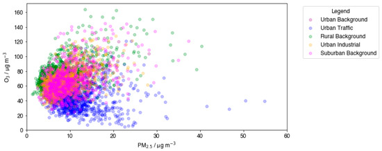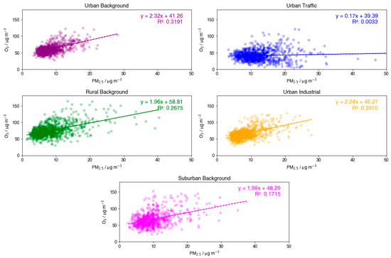 The relationship between O3 and PM2.5 at each environmental type is displayed in Figure 3. O3 was plotted as MDA8 to account for the strong diurnal variations of the pollutant. O3 is considered to be a secondary pollutant in the boundary layer, formed from photochemical oxidation reactions; thus, co-pollution of O3 and PM2.5 is a better indicator of secondary PM2.5, which can form as a result of the same OH-initiated reactions as O3.