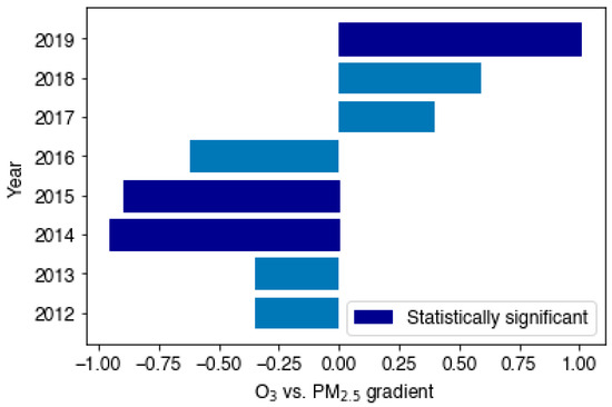 A horizontal bar graph depicting the changing O3 vs. PM2.5 gradients across the 10-year period at LMR, where data coverage was sufficient (>70%). Statistically significant annual plots at the 95% confidence level are shown in navy blue.