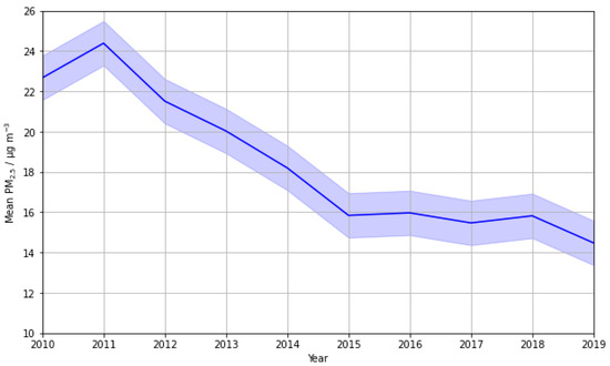 To infer the significance of PM2.5 reductions on the observed annual O3 vs. PM2.5 relationships and the 2017 inversion, a timeseries plot of mean annual PM2.5 concentrations was plotted (Figure 6), including the data from all seasons. Overall, the timeseries plot shows a decrease across the time period. PM2.5 peaked at 24.4 µg m−3 in 2011 and dropped by 40.6% to 14.5 µg m−3 in 2019. The sharpest decrease occurred from 2011 to 2015, where a 35% decline was observed, accounting for 86% of the total decrease. From 2015 to 2018, mean PM2.5 stabilised at approximately 16 µg m−3. A further absolute decrease of 1.34 µg m−3 was observed from 2018 to 2019.