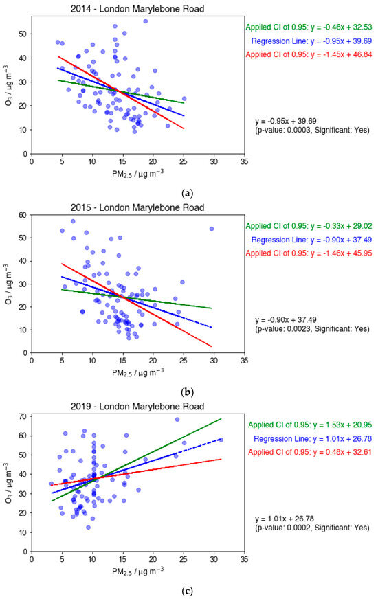Three UT sites were included in the analysis: Birmingham A4540 Roadside (BAR), Birmingham Tyburn Roadside (BTR), and London Marylebone Road (LMR). Comparison of O3 vs. PM2.5 scatter plots at the three UT sites (Appendix B, Figure A2) show that both Birmingham sites demonstrate a positive correlation between pollutants. Conversely, the overall correlation at LMR is negative. Given the negative correlation between PM2.5 and O3 seen at LMR, it can be inferred that reducing PM2.5 concentrations may play a part in increased O3 ground-level concentrations in summer months as has been observed in Beijing, China [20]. Further dissection of this relationship on an annual basis demonstrated a clear ‘tipping point’ at which LMR moves from a statistically significant negative correlation (2014–2015) to a statistically significant positive correlation in recent years (2019) (Figure 5).