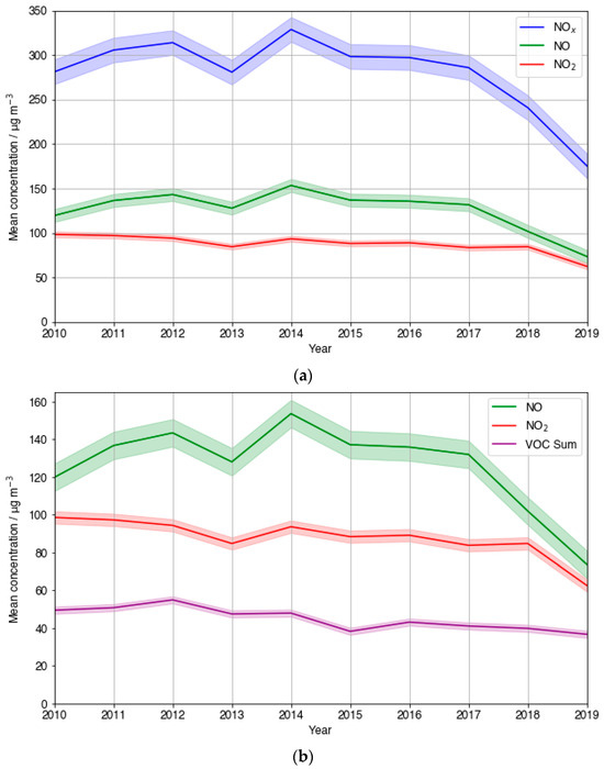 A timeseries plot of the 10-year trend in (a) mean NOX, NO, and NO2 and (b) NO, NO2, and summed VOC concentrations at LMR.