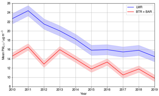 A timeseries plot showing the 10-year trend in average mean daily PM2.5 (µg m−3) from 2010 to 2019 at all UT sites: LMR (blue), with BAR and BTR combined (red).