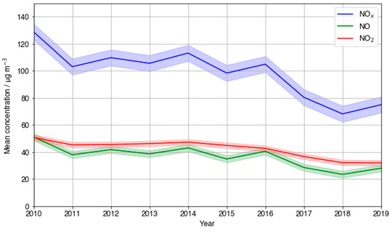 Measured data of O3, NOx, and PM2.5 concentrations were extracted for the 10-year period from January 2010 to December 2019 from the UK’s national compliance monitoring network, the AURN data archive [26]. The data selection specifically avoided measurements taken during the COVID-19 pandemic and associated lockdowns that may skew pollutant analyses. The AURN is supported by the UK’s Department for Environment, Food and Rural Affairs (DEFRA); it records measurement data for a number of air pollutants across 170 air quality monitoring sStations (AQMS) [27].