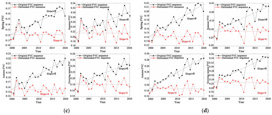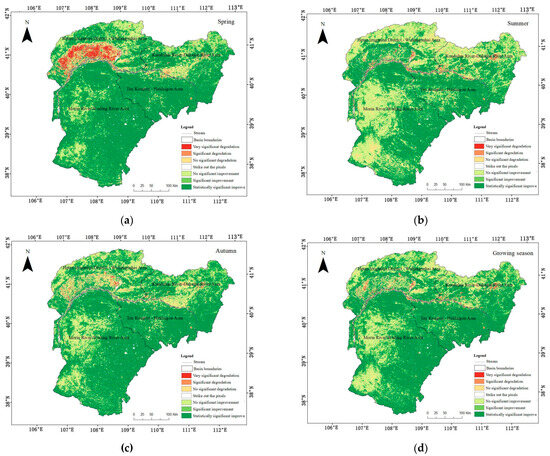 The overall improvement in FVC in the growing season and the spring season in the Yellow River Basin was observed in more than 90% of the basin’s total area, of which the Ten Kongtui–Heidaigou Area showed a statistically significant improvement in FVC, which, respectively, accounted for 81.99% and 85.23% of its total area. Moreover, in summer and autumn, the FVC in the Morin River–Wuding River Area showed a significant increasing trend and, respectively, accounted for 95.93% and 97.58% of the Inner Mongolia section. In summer, vegetation degradation became a more serious concern in the Kundulun River–Daheihe River Area, mainly distributed in the centre of the city; the accelerated urbanisation process in this area put considerable pressure on its vegetation ecosystem. Furthermore, in autumn, the Hetao Irrigation District–Wuliangsuhai Area showed a degradation trend over a larger area (accounting for 11.42% of the total area of the watershed).