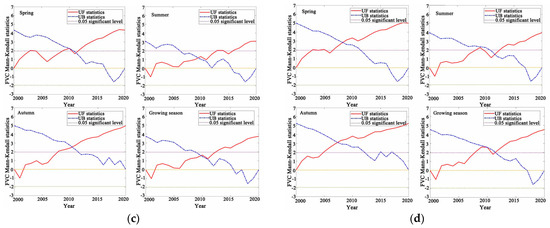 Figure 3, the intersection of FVC UF and UB in the Hetao Irrigation District–Wuliangsuhai Area at the given significance level of α = 0.05 at all seasonal scales except autumn appeared during 2011–2012, and the UF curve exceeded the critical value after 2012, which indicated that the trend of increase in FVC was very obvious, whereas the intersection of UF and UB in autumn was more than 1.96, which it indicates that the test is not passed; thus, it is not mutable. The UF curve of FVC in the Kundulun River–Daheihe River Area slice in spring exceeded the critical value after 2014, and the mutation point was between 2012 and 2013, the summer mutation point was between 2016 and 2017, and the autumn and growing season mutation point was in 2014. The UF curve of FVC during spring in the Morin River–Wuding River Area exceeded 1.96 near 2012, and its mutation point existed between 2011 and 2012. During summer, autumn and the growing season, the UF curve ranged between −1.96 and 0 near 2000–2002, indicating that the trend of change and mutation were not obvious and the sequence showed a decreasing trend, and the summer and growing season mutation point existed during 2009–2010. In the summer and growing seasons, the mutation point was found in 2011–2012 in the area of the Ten Kongtui–Heidaigou Area.