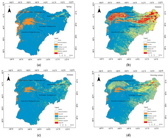 2, accounting for 25.60% of the total area of the Yellow River Basin; meanwhile, the Morin River–Wuding River Area accounted for the smallest proportion of FVC, accounting for 0.69% of the total area of the basin in the same season. The FVC proportion decreased in the spring season, when the percentage of medium–low FVC went up to 90% or more in all four areas comprising the Inner Mongolia section.