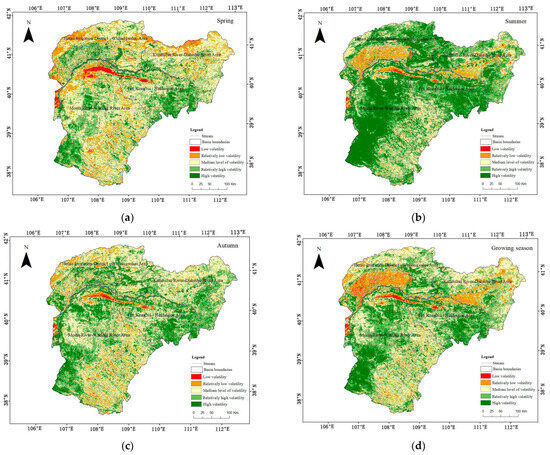 16]. The northern part of the Kundulun River–Daheihe River Area was mainly marked by relatively low volatility and medium volatility, while the northern part of Morin River–Wuding River Area had low volatility (as this area is a desert zone) [