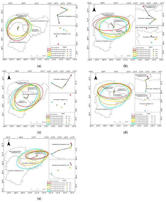 Figure 6, the centre of gravity of low FVC showed a northward migration trend from 2000 to 2020, indicating a migration of about 63.16 km, mainly concentrated in the vicinity of Kubuqi Desert in the Morin River–Wuding River Area. Meanwhile, the middle–low FVC migrated from the Hetao Irrigation District–Wuliangsuhai Area to the Ten Kongtui–Heidaigou Area, indicating a total migration of 85.40 km. Moreover, the medium FVC shifted to the southwest by 51.48 km and to the northwest by 36.44 km in the 2000–2010 and 2010–2020 periods, respectively. Over the 2000–2020 period, the middle–high fractional vegetation coverage showed a southward migration trend, indicating a total migration of 72.62 km, while the high fractional vegetation coverage, mainly concentrated in the Kundulun River–Daheihe River Area, migrated 8.00 km to the southeast and 95.17 km to the southwest in the 2000–2005 and 2005–2020 periods, respectively. Owing to the overall increasing trend in FVC, the range of middle–high FVC and the high FVC scale error ellipses increase, while the overall area FVC expands to the western part of the Inner Mongolia section in the Yellow River Basin.