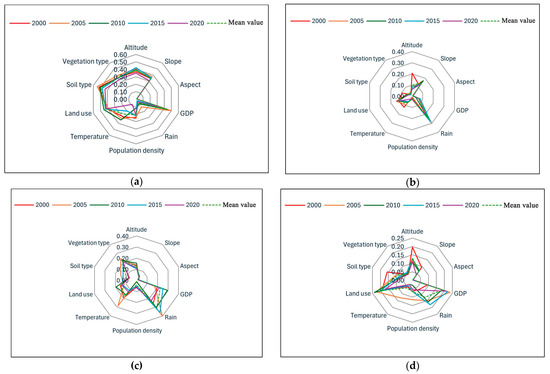 Figure 8, the influences of soil type, land use and GDP on FVC in the Hetao Irrigation District–Wuliangsuhai Area were consistently ranked among the top-three concomitant influences in the 2000–2020 period, with explanatory powers of more than 40%; however, the explanatory power of this area’s climatic and topographic factors regarding FVC change was found to be low. Moreover, the FVCs in Morin River–Wuding River Area and the Kundulun River–Daheihe River Area were mainly influenced by rainfall in the same period. The secondary driving factors in these areas were GDP and slope, while aspect and population density had low explanatory powers. Meanwhile, the mean values of the explanatory power of each driver in the Ten Kongtui–Heidaigou Area were classified in a descending order as follows: land use > GDP > altitude > rainfall > soil type > slope > population density > temperature > vegetation type > aspect. Additionally, land use, GDP and altitude were the main driving factors of FVC change in this area, possibly due to its topography as well as the implementation of various related policies in this area in recent years.