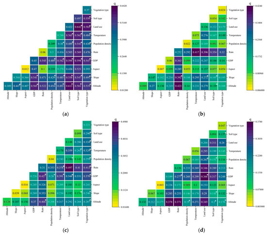 The Hetao Irrigation District–Wuliangsuhai Area had more types of interaction involving two-factor enhancement; here, the q value of the interaction between land use and soil type reached the highest value of 0.642 in the 2000–2020 period, while the average q value of the interaction between land use and other factors was greater than 0.55, out of which only slope direction and rainfall showed nonlinear enhancement while interacting with other factors. In contrast, most of the FVC factor interactions in the Kundulun River–Daheihe River Area showed a nonlinear enhancement trend; for this area, the mean value of q was greater than 0.36 when rainfall interacted with other factors. Additionally, the q value of the rainfall–land use interaction in the Morin River–Wuding River Area was high (0.497), and its explanatory power increased when rainfall interacted with other factors. Furthermore, the q values regarding the interactions between altitude and rainfall, altitude and GDP and GDP and land use in the Ten Kongtui–Heidaigou Area were all above 0.36, among which only temperature and aspect showed nonlinear enhancement with respect to their interaction with other factors; all the other factors showed two-factor enhancement in their interactions with other factors. Thus, it is clear that the FVC in the Inner Mongolia section of the Yellow River Basin was due to the combined effect of various relevant factors.