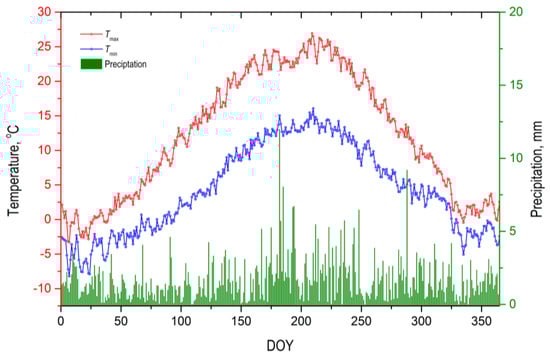 Maximum and minimum daily temperatures (°C) and amounts of precipitation (mm) during the observation period of 2015–2022 (DOY—day of the year).