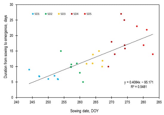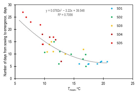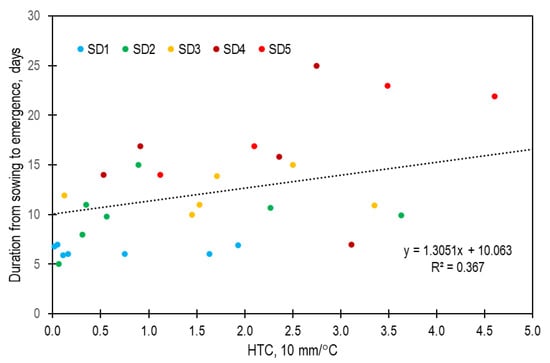 The main factors that can extend the time from sowing to emergence are unfavorable environmental conditions, including soil moisture and temperature. Selyaninov’s hydrothermal coefficient (HTC) was estimated for each sowing case, and then the average of this coefficient was calculated depending on the sowing time (Table 1). The relationship between the number of days from sowing to emergence and HTC showed that winter wheat emerged successfully even when moisture conditions during this period were minimal (Figure 3). More precipitation occurred within the longer germination period, but no significant relationship was found between sowing time and rainfall (p > 0.05). According to the HTC classification values, moisture was optimal at the time of SD1 and SD2 sowings (first half of September) [34] and increased to very wet and extremely wet during subsequent sowings. It can be concluded that soil moisture conditions are usually sufficient for the emergence of winter wheat in middle and higher latitudes.