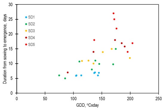 Another important factor influencing the emergence of winter wheat is temperature. The dependence of the number of days from sowing to emergence on the average temperature during this period is shown in Figure 4. This figure clearly shows a trend: the higher the temperature of the germination period, the faster the germination of winter wheat. The average temperature during the emergence period of the first wheat sowing (SD1) was 18.5 °C (max 24.4 °C, min 12.0 °C), and that of the latest sowing (SD5) was 8.6 °C (12.6 °C and 4.8 °C, respectively) (Table 1). However, a more important parameter defining the conditions for winter wheat germination is the heat resources, which are estimated by calculating growing degrees days (Figure 5). The dependence shows that, as the duration of germination increases, the GDD accumulated during this period also increases. Considering the lower temperature at later sowings (SD4, SD5), a longer period and a higher GDD are required for germination. SD1 and SD2 sowings have almost the same GDD (126.5 ± 16.7 and 128.9 ± 24.1 °C × day, respectively), although the average emergence temperature of SD2 sowings was 14.0 °C, which was 4.5 °C lower than the SD1 sowing temperature (18.5 °C) (Table 1). The equal accumulated GDD during the emergence period indicated the optimal temperature range and required GDD for winter wheat emergence in the cases of the first two sowings. For SD3 sowings, the accumulated GDD during the emergence period was about 15% higher (149.2 °C × day), although the average temperature decreased slightly during the period (from 14.0 °C to 12.3 °C, max 17.1 °C, min 7.6 °C). This suggests temperatures below 14.0 °C were too low for optimal winter wheat emergence. The temperature of the SD4 sowings was not much different from that of SD3, and a significantly lower temperature during the emergence period was characteristic of SD5 sowing. The highest value of GDD was found for the latest sowing (SD5), reaching 200 °C × day, and the average accumulated heat value for SD5 was 175.8 ± 21.5 °C × day (Figure 4, Table 1). In summary, regarding the temperature conditions for winter wheat emergence, it can be stated that the optimum temperature was higher than 14 °C. Under optimal temperature conditions, winter wheat required a lower GDD value of 125–130 °C × day. The lowest temperature at which winter wheat can still germinate successfully was around 8 °C (average SD5—8.6 °C); however, in this case, winter wheat required a longer emergence period of 3 weeks, during which the accumulated GDD could reach 175–200 °C × day.
