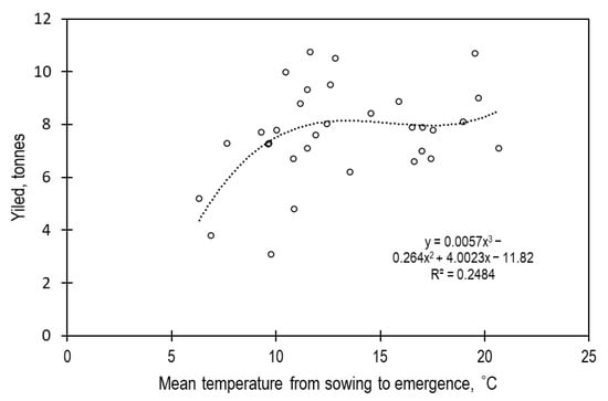 The following year’s spring and summer vegetation of winter wheat is determined by meteorological conditions, which are the same for all sowings, and differences are difficult to notice during phenological observations. Despite this, the yields for different sowings are not the same, which means that autumn conditions determine the following year’s vegetation. Figure 6 shows how the yield depends on the temperature during the emergence period of winter wheat. The low temperature of the germination period also determines the lower yield (Figure 6). This graph confirms the results presented earlier, which state that the optimum average temperature for winter wheat germination should not be lower than 12 °C.