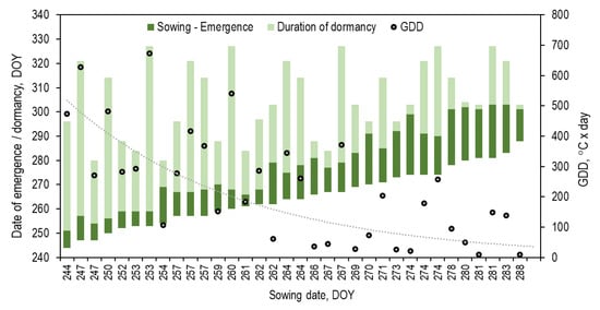 The day of the year (DOY) of dormancy onset was determined in this study using the condition that the accumulated GDD over three consecutive days was less than 9 °C × day. The relationship between the onset of dormancy and the accumulated GDD from emergence to the onset of winter dormancy is shown in Figure 7. The later the sowing (x-axis), the shorter the period until dormancy. Accordingly, the accumulated GDD during the period from emergence to dormancy obviously decreases. Decreasing GDD values indicates that with later sowing dates, plants have less time and fewer heat resources for winter preparation. Although the onset of dormancy is the same for all sowing times, the GDD varies from emergence to dormancy.