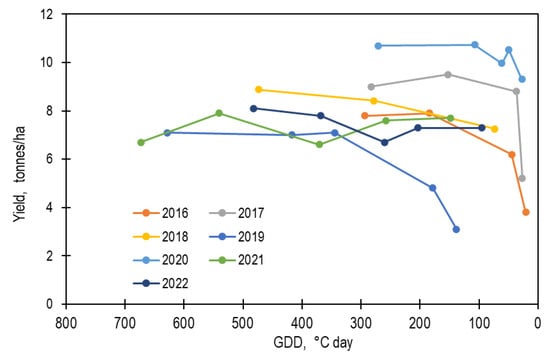 The impact of GDD accumulation during late autumn vegetation on winter wheat yield is shown in Figure 8, indicating a distinct minimum threshold of 100 °C × day, corresponding to the minimum GDD requirement for proper winter preparation. In 2016 and 2018, winter wheat required a higher GDD accumulation during autumn vegetation. Upon examining the meteorological conditions of this year, we found that the winter season was colder compared to other years. This was characterized by lower temperatures with brief warm spells, during which the snow melts, potentially negatively affecting winter wheat dormancy. Additionally, a higher GDD accumulation during late autumn vegetation did not have a negative impact on winter wheat yield (Figure 8). In summary, we can conclude that the minimum GDD required for winter preparation in winter wheat is 100 °C × day, while a safe level of GDD, allowing preparation for colder winters typical in both Lithuania and temperate latitudes, is 300 °C × day.